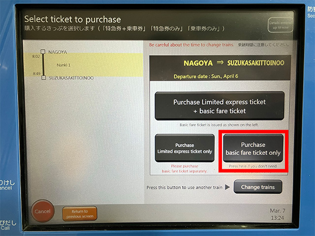 When taking a limited express train (and purchasing a limited express ticket), select the desired limited express train.