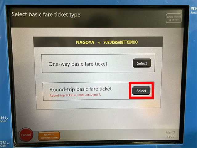 You can purchase a round-trip ticket between Nagoya and Suzuka Circuit Ino at the Reserved seat ticket vending machine at Nagoya Station. This way, you won't need to buy a ticket at Suzuka Circuit Ino Station, so purchasing a round-trip ticket is recommended.