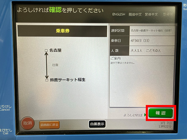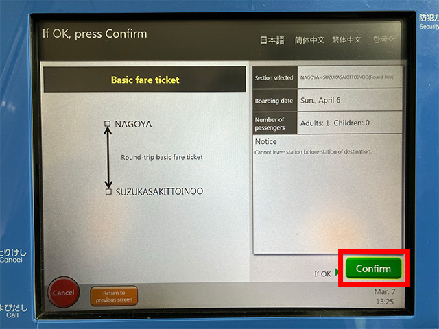If there are no issues, press confirm, pay the displayed fee, and complete the ticket purchase.