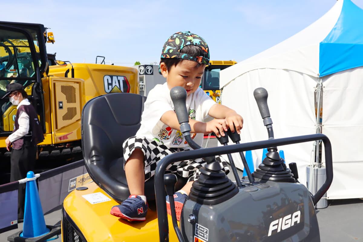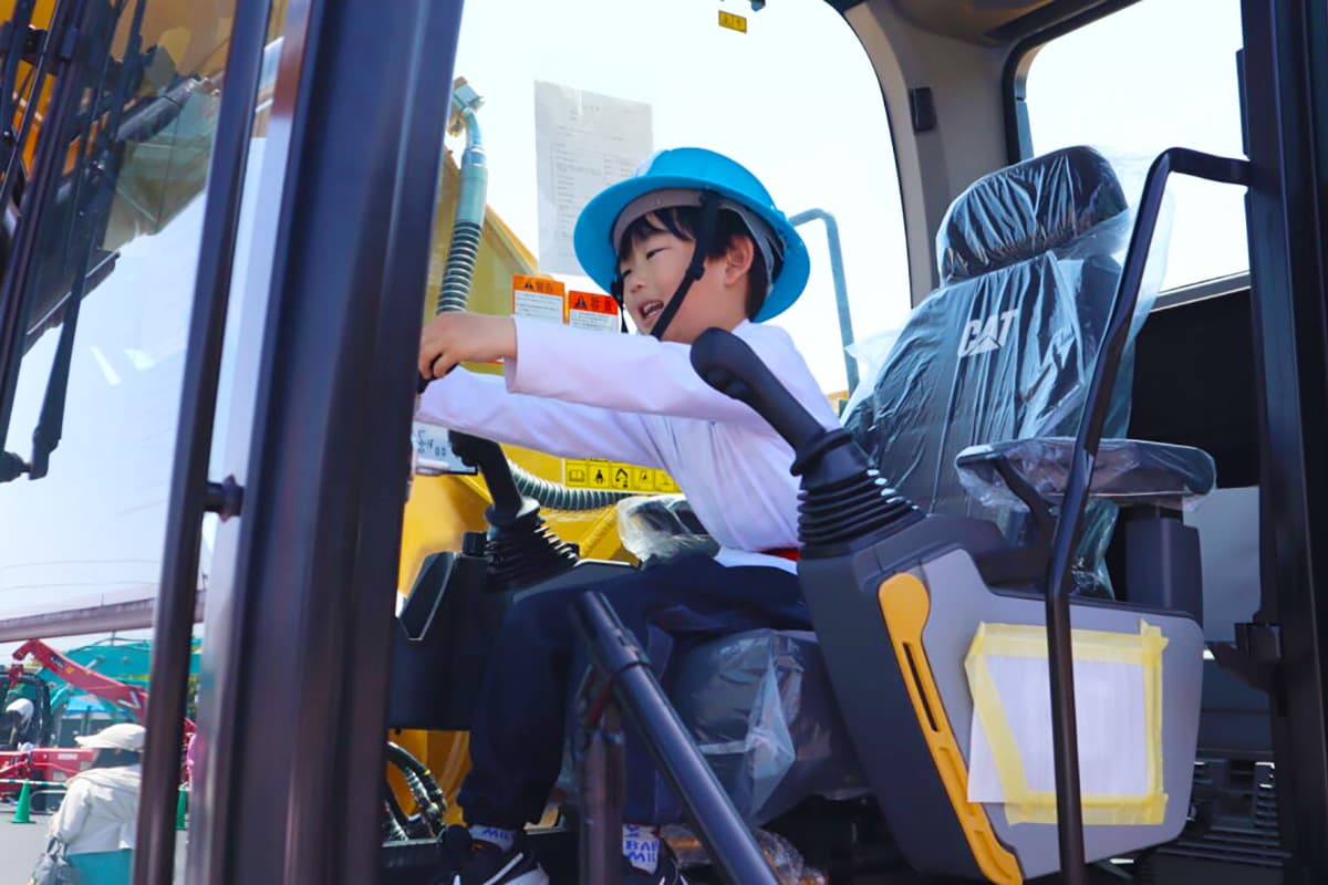Sit on the driver's seat of working vehicles and touch the steering wheel and levers.
