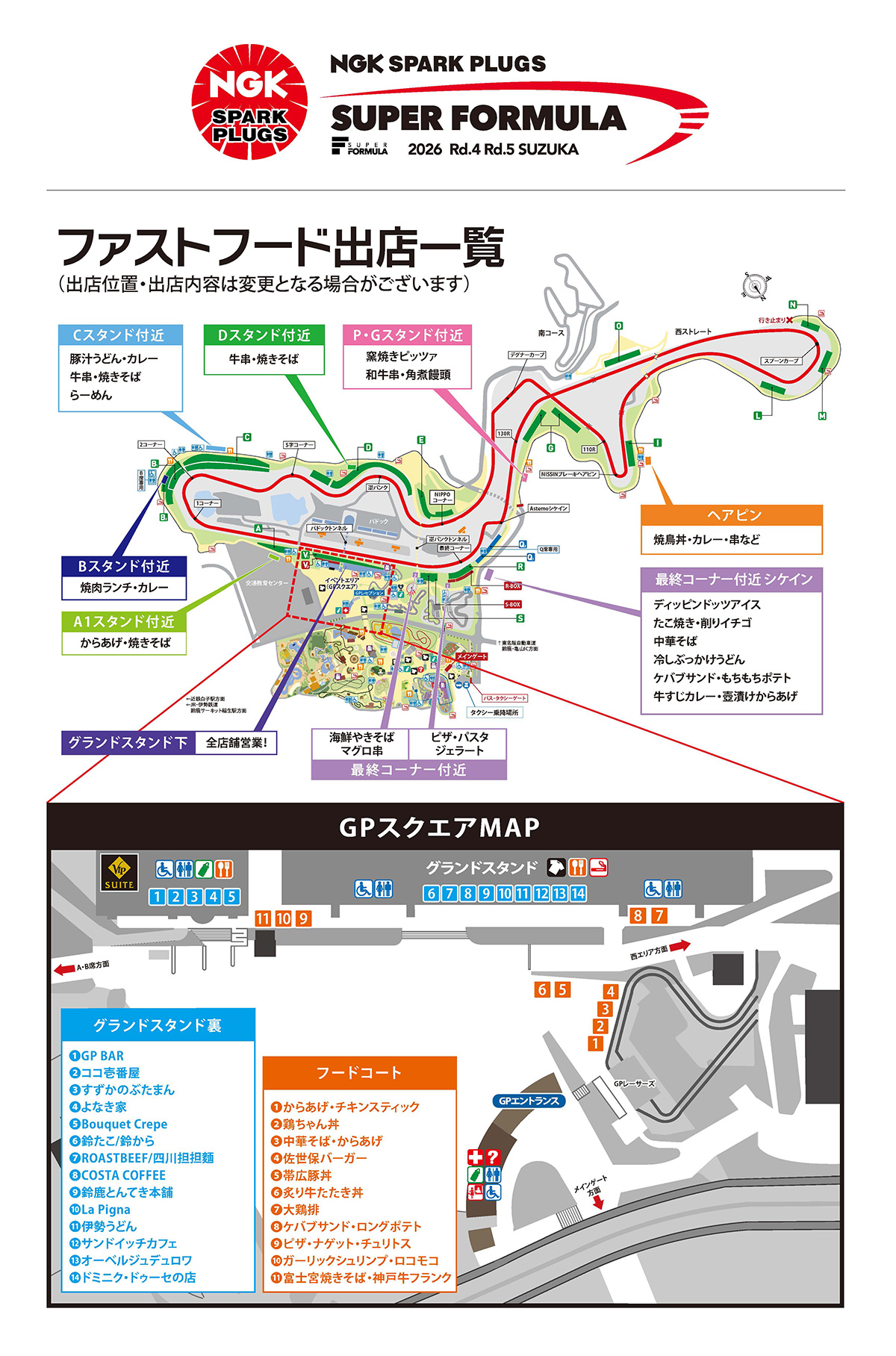 April 22, 2026 Recommended food information In addition to the park and GP Square, you can enjoy various gourmet foods along the course side. Download here (PDF: 570KB)