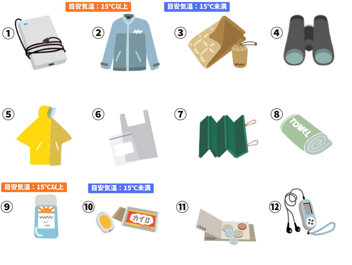 We have published a list of standard items to bring for watching and useful items depending on the temperature on the day, so check here!