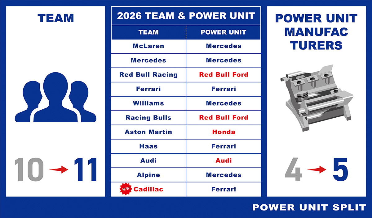 そんな2026年に向けて参戦チーム、ドライバーの変更点を確認しよう。キック・ザウバーはドイツの自動車メーカー、アウディによるチーム買収に伴い、アウディF1チームへと体制を移行。そして完全な新チームとしてアメリカのGM(ゼネラルモーターズ)の高級ブランド、キャディラックをチーム名とした新チーム『キャデラックF1チーム』が参戦を開始し、チーム数が11、台数が22台に増加する。