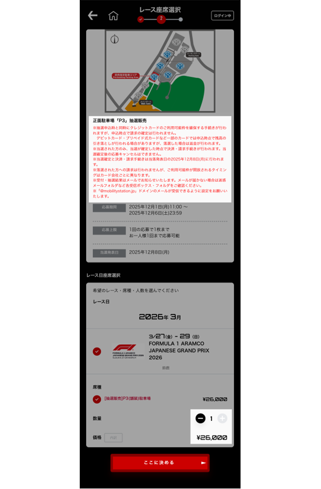 正面駐車場「P3」は、以下の観戦席チケット(Formula 1 Paddock Club™・VIPスイート・R-BOX・GRAN VIEW・S-BOX)との同時購入限定商品として販売していますが、完売に至らない見込みのため、一部駐車枠を同時購入限定商品ではない、一般抽選販売方式に変更します。