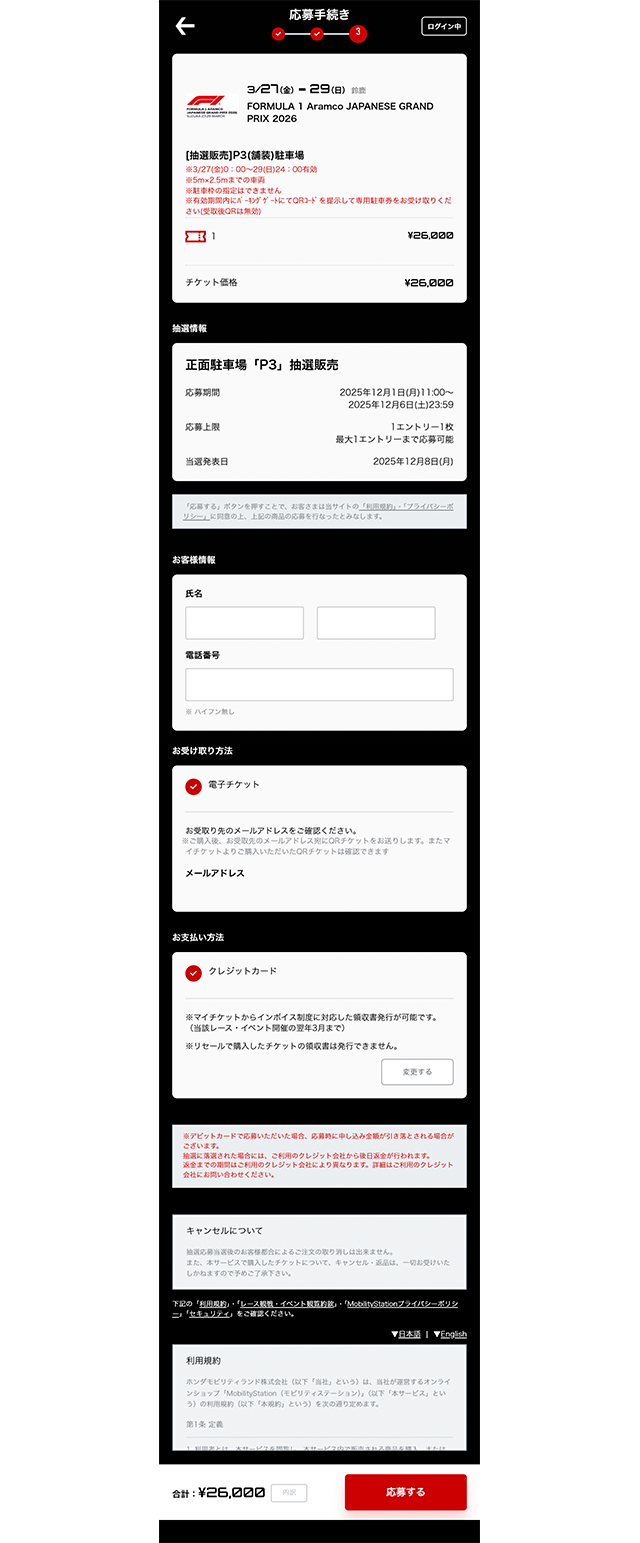 ・応募内容と金額をご確認いただき、お支払い方法にカード情報を入力し、ページをスクロールして「利用規約」・「レース観戦・イベント観覧約款」・「MobilityStationプライバシーポリシー」「セキュリティ」をお読みのうえ、「応募する」ボタンを押してください。