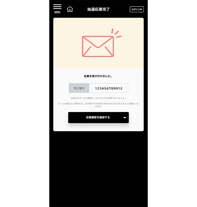 受付番号をお控えいただき、同時に送信している抽選申込完了のメールをご確認ください。