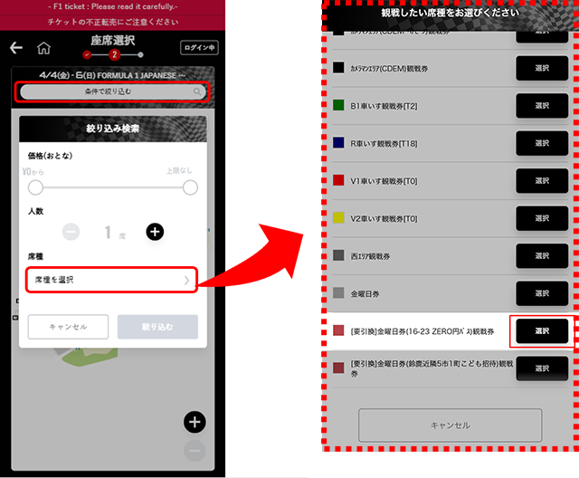 条件で絞り込む→席種を選択→スクロールして「16-23 ZERO円パス」を選択の手順で申し込み手続きをお願いします。