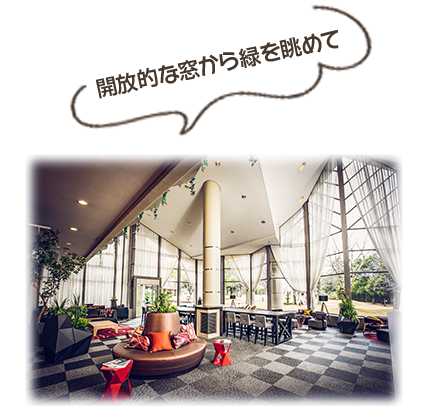 落ち着いた雰囲気のTHE MAIN ホテルラウンジ中庭を眺めながらゆっくりと過ごしていただけます。
