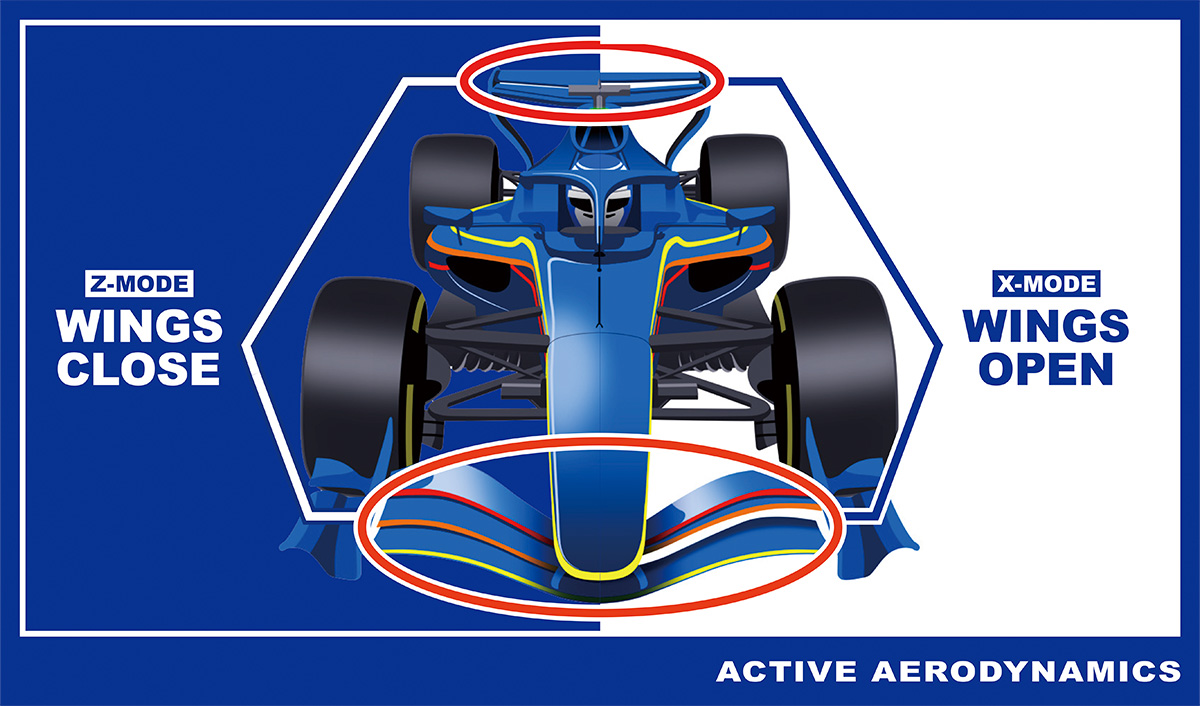 從2026年開始的新『主動空氣動力學』不僅後翼可動,前翼也將成為可動式。設有標準狀態的『Z模式』與低阻力規格的『X模式』,駕駛員可不受地點限制自由切換。