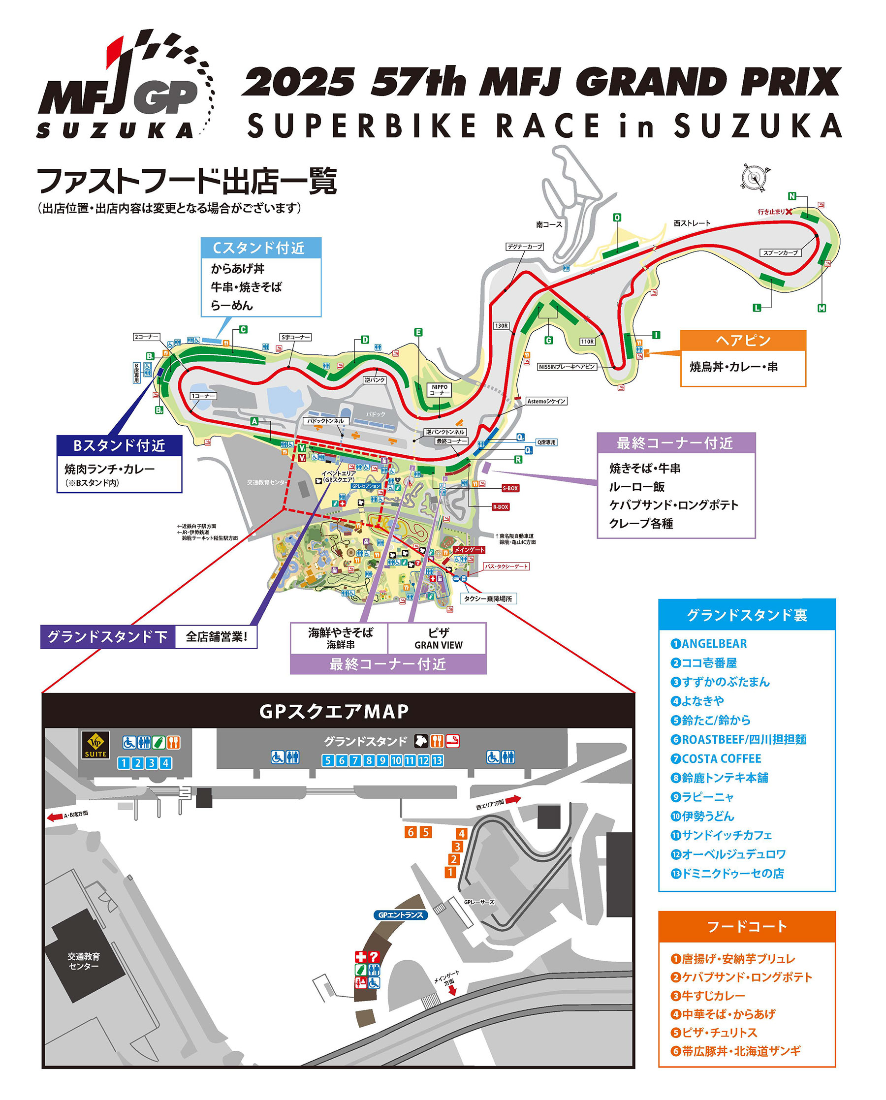 <2025 MFJ全日本公路賽選手錦標賽系列年度賽程>大會名稱 舉辦地點 開催日 舉辦類別 茂木2&4賽事 茂木移動度假村(栃木) 4月19日(週六) ~ 4月20日(週日) JSB1000 超級摩托車賽 in SUGO 運動之地SUGO(宮城) 5月24日(星期六) ~ 5月25日(星期日) JSB1000,ST1000,ST600,J-GP3,JP250 筑波大賽 筑波賽車場(茨城) 6月21日(星期六) ~ 6月22日(星期日) J-GP3,JP250 超級摩托車賽 in 茂木 茂木移動度假村(栃木) 8月23日(星期六) ~ 8月24日(星期日) JSB1000,ST1000,ST600,J-GP3,JP250 超級摩托車賽 in 九州 奧托波利斯(大分) 9月13日(星期六) ~ 9月14日(星期日) JSB1000,ST1000,ST600,J-GP3,JP250 超級摩托車賽 in 岡山 岡山國際賽車場(岡山) 10月4日(星期六) ~ 10月5日(星期日) JSB1000,ST1000,ST600,J-GP3,JP250 第57屆 MFJ大獎賽 超級摩托車賽 in 鈴鹿 鈴鹿賽車場(三重) 10月25日(星期六) ~ 10月26日(星期日) JSB1000,ST1000,ST600,J-GP3,JP250